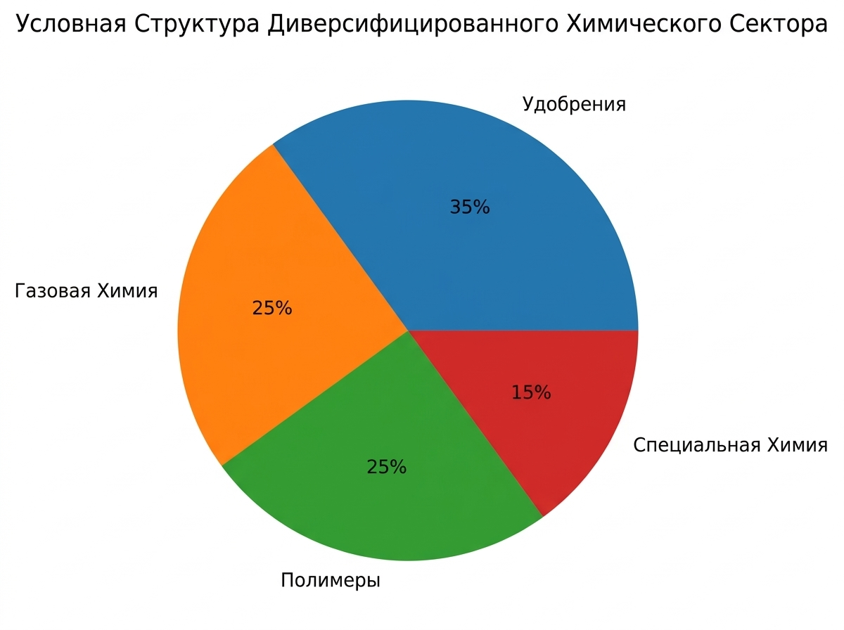 Диаграмма структуры химической отрасли выше демонстрирует типичную модель диверсифицированного химического сектора, в котором удобрения, базовая химия, полимеры и специализированная продукция формируют сбалансированную промышленную систему.