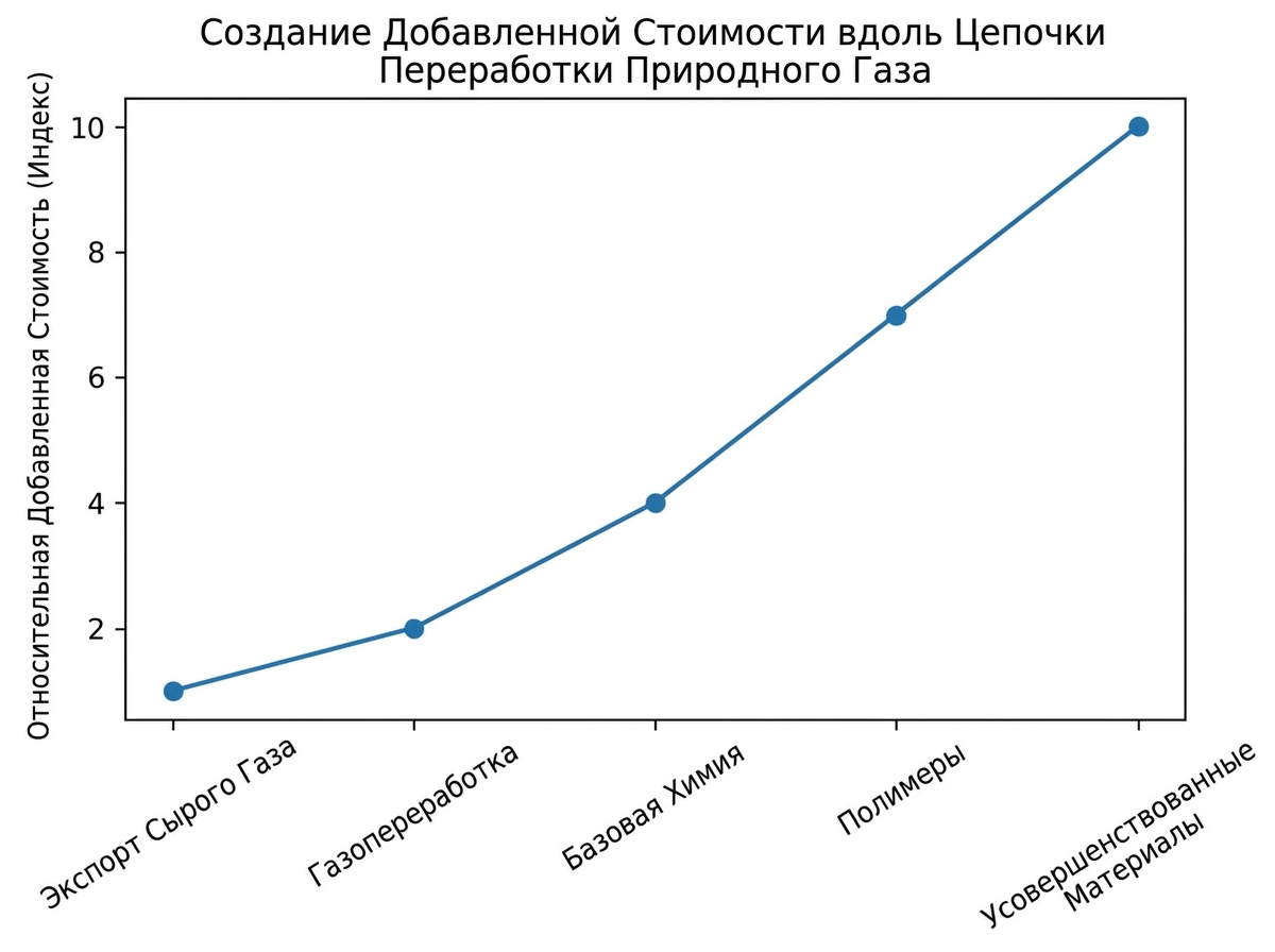 Переход от экспорта сырья к производству химической продукции радикально изменяет структуру создаваемой стоимости. Если поставки необработанного газа формируют минимальный уровень доходности, то последующие стадии переработки — производство базовой химии, полимеров и специализированных материалов — многократно увеличивают экономическую отдачу ресурсов.